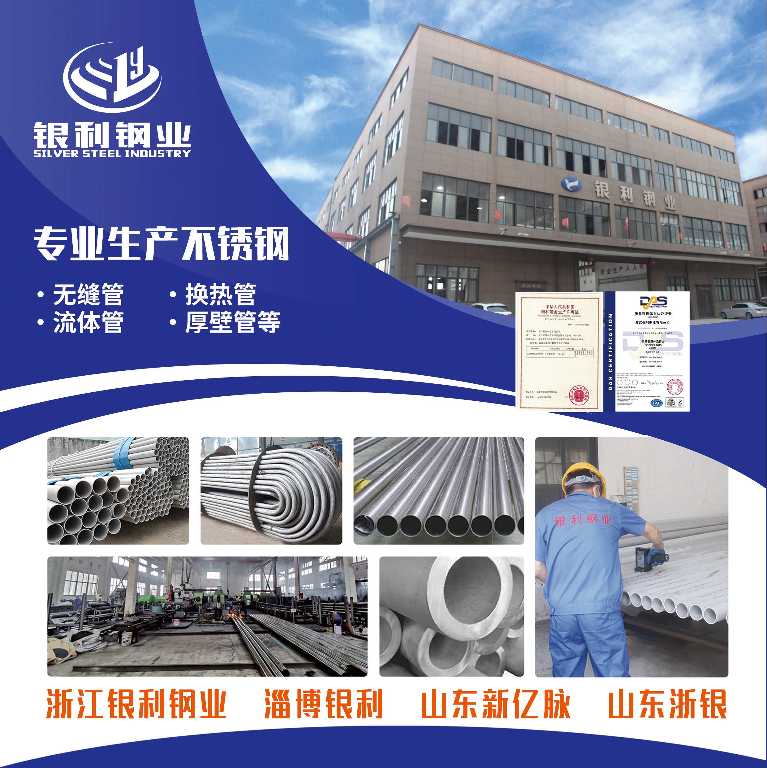 浙江銀利鋼業(yè)有限公司位于溫州市龍灣區(qū)空港新區(qū)金海二道916號(hào),是一家專業(yè)生產(chǎn)、加工、銷售各類不銹鋼無縫鋼管的綜合性生產(chǎn)企業(yè)。已通過特種設(shè)備生產(chǎn)許可證:TS271052Y-2025;主要生產(chǎn)的產(chǎn)品有:TP304、TP316、304L、321、310S不銹鋼管等多種材質(zhì),規(guī)格齊全(可按客戶要求定做),竭誠(chéng)歡迎各界朋友前來洽談合作。