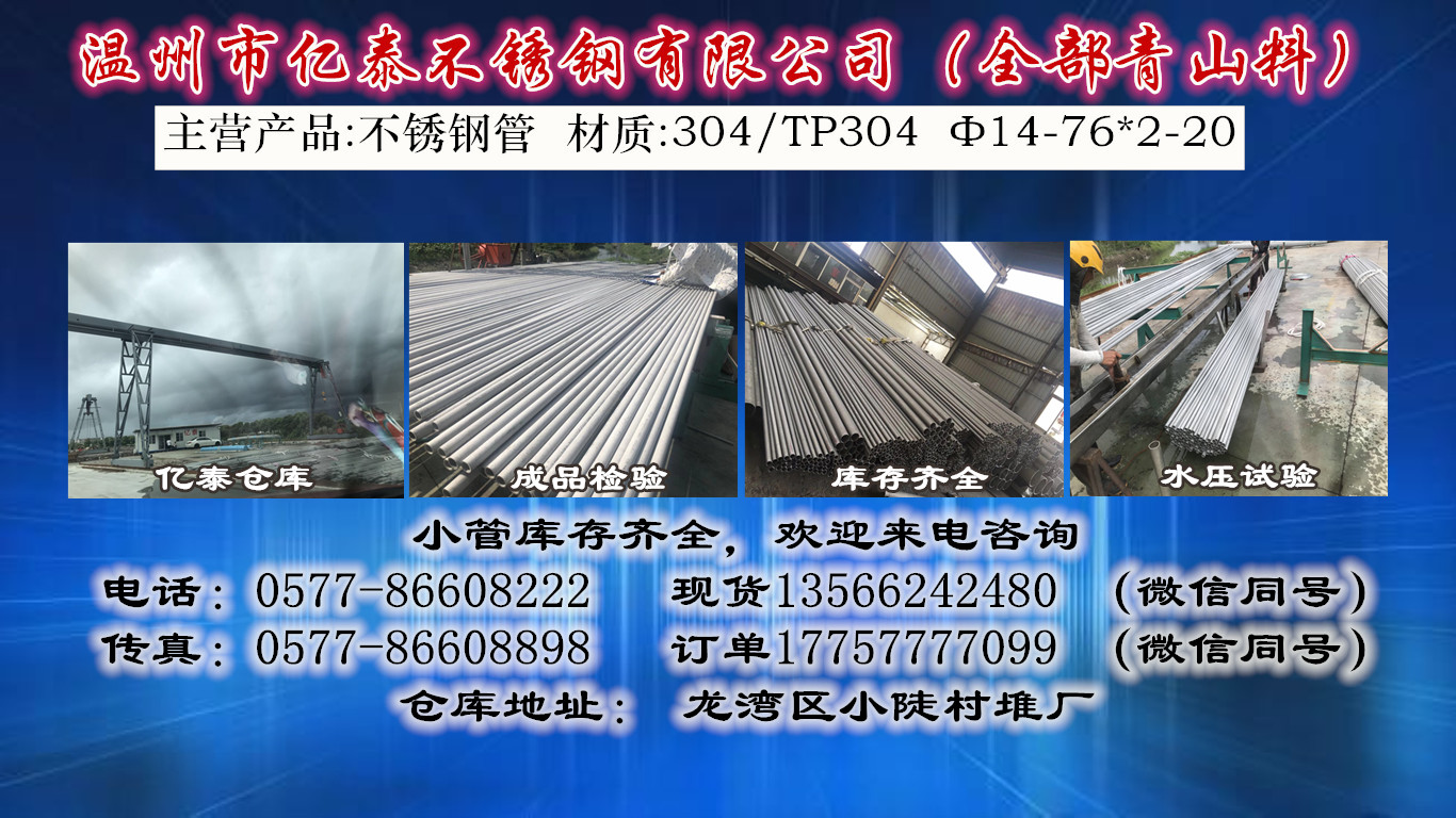 浙江盛洋不銹鋼有限公司是集生產(chǎn)銷售于一體的綜合性大型企業(yè)。專業(yè)生產(chǎn)各種型號(hào)的不銹鋼無縫管及工業(yè)無縫管,以TP304/304材質(zhì)為主。資源充足,品種齊全,庫存量大,價(jià)位特低,供貨時(shí)間最短 拼搏實(shí)干,開拓創(chuàng)新,積極進(jìn)取,合作共贏的原則,以優(yōu)質(zhì)的服務(wù),靈活的經(jīng)營模式開拓市場,在廣大新老客戶的協(xié)助支持下,不斷發(fā)展壯大。誠信是企業(yè)的生命,您的需要是我們的立業(yè)之本! 電話:0577-86608222 熱忱歡迎廣大新老客戶蒞臨指導(dǎo)!