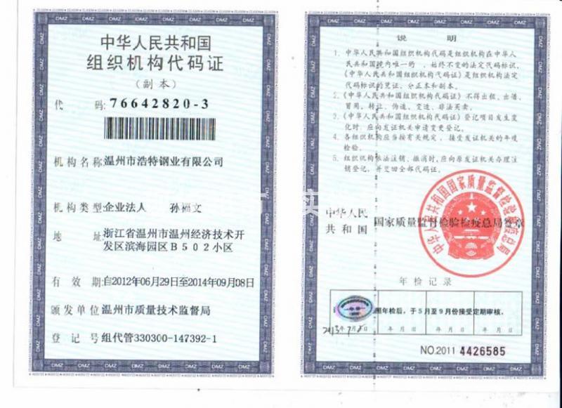 | 企業(yè)名稱(chēng) | 溫州市浩特鋼業(yè)有限公司 | 統(tǒng)一社會(huì)信用代碼 | 330305000010338 |