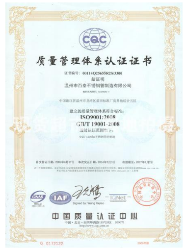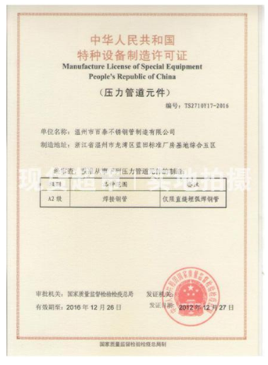 溫州市百泰不銹鋼管制造有限公司已取得國家特種設備制造許可證及ISO9001:2008質量體系,整套生產(chǎn)及檢測設備先進齊全,擁有800噸7米長液壓成型卷管機、1000噸10米長液壓成型卷管機、300噸液壓成型機、進口自動焊機、自動等離子機、液壓剪板機、X射線探傷機、水壓試驗機、冷拔機等。
